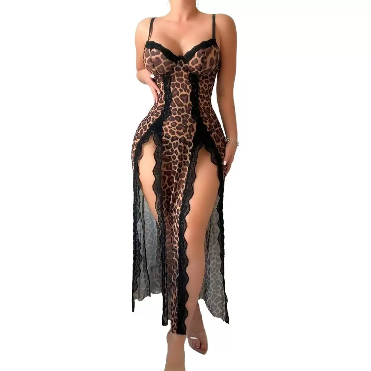 Robe longue transparente à imprimé léopard avec bordure en dentelle noire – Design séduisant à fente pour des soirées intimes